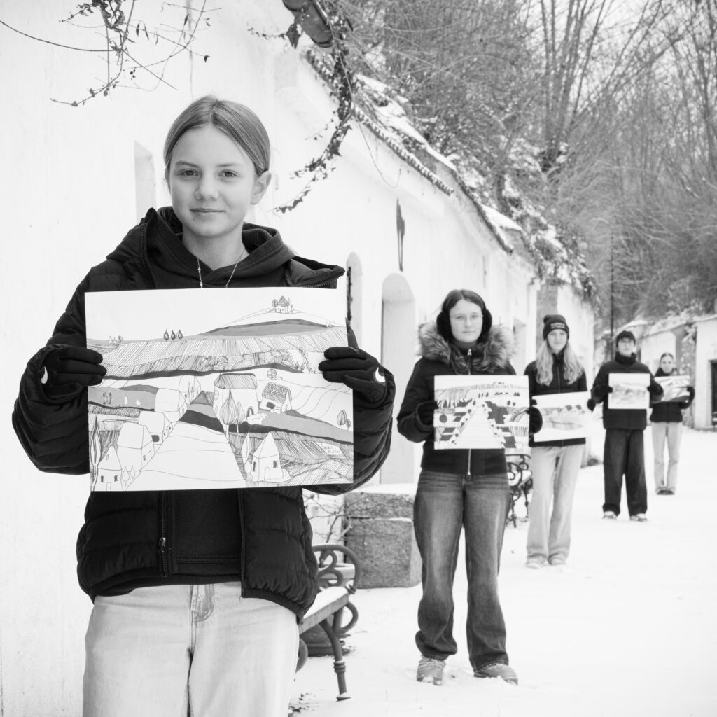 Von den rund 1.300 Kellergassen Niederösterreichs liegen die meisten im Weinviertel, wo diese besondere Bautypologie tief im kulturellen Gedächtnis verwurzelt ist. Ausgehend von dieser Verankerung involviert „Kellergasse: Kindheit“ Schülerinnen und Schüler der MS Mistelbach in einen mehrstufigen, intergenerationalen Gestaltungsprozess. Inspiriert durch die Bildsprache Franz Rudolf Kunz‘ entstehen Kellergassenbilder, die im Rahmen eines Erzählcafés mit den Erinnerungsspuren der Bewohnerinnen und Bewohner des Urbanusheims Poysdorf angereichert werden. Im Sinne der sozialen Plastik steht dabei am Ende nicht das einzelne Kunstobjekt im Vordergrund, sondern der soziale Prozess, der dieses formt.